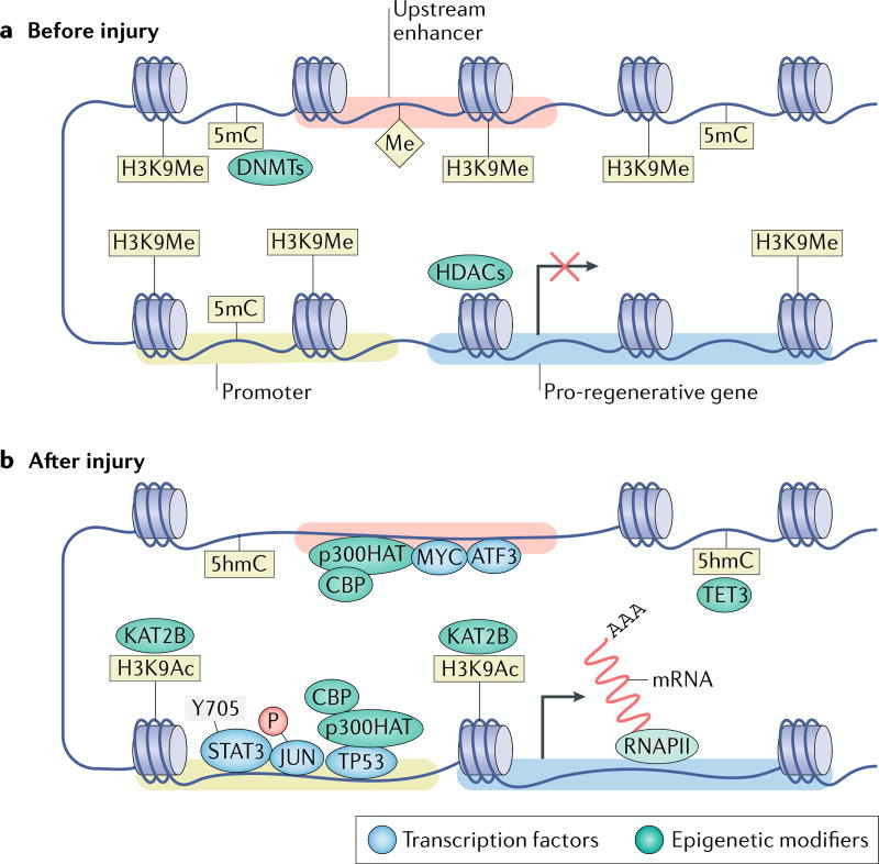 a | When dorsal root ganglion neurons have formed synapses and are electrically active, pro-regenerative gene bodies, promoters and enhancers are maintained in a transcriptionally repressed state through DNA methylation by DNA (cytosine-5)-methyltransferases (DNMTs), histone methylation by yet unknown histone methyltransferases and deacetylation by histone deacetylases (HDACs)20,28,179. b | Following injury, the nuclear export of HDACs20 and import of the histone acetyltransferase (HAT) KAT2B166 causes an increase in acetylation of histone H3K9 (H3K9Ac), whereas the upregulation of the methylcytosine dioxygenase TET3 causes the conversion of repressive 5-methylcytosine (5mC) into 5-hydroxymethylcytosine (5hmC)28. Similarly, CREB-binding protein (CBP) and p300 HAT, HATs that frequently bind to both enhancers and promoters, associate with cellular tumour antigen p53 (TP53) to increase H3K9Ac in pro-regenerative gene promoters144,248. The turnover of transcriptionally repressive marks into activating marks likely causes a relaxation in the chromatin, which should allow pro-regenerative transcription factors — such as Myc proto-oncogene protein (MYC), cAMP-dependent transcription factor ATF3, transcription factor AP-1 (JUN) and signal transducer and activator of transcription 3 (STAT3) — to bind regulatory elements and influence the transcription of downstream pro-regenerative genes. H3K9Me, methylation of histone HeK9; P, phosphorylation; RNAPII, RNA polymerase II.