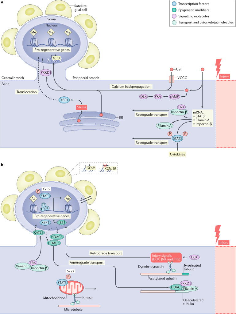 a | Early injury signalling events. Following injury, calcium rapidly flows into the damaged axon and is actively propagated to the cell soma by voltage-gated calcium channels (VGCCs) and the release of calcium by internal stores in the endoplasmic reticulum (ER). The release of stored calcium also triggers cellular stress pathways in the axon, resulting in the splicing of X-box-binding protein 1 (XBP1) and its translocation to the nucleus91. The increase in calcium activates pro-regenerative pathways at the site of injury and in the cell soma. For example, near the injury site, calcium activates cAMP, which in turn activates protein kinase A (PKA). PKA then activates dual leucine zipper-bearing kinase (DLK), a key mediator of later regenerative events34. Similarly, calcium at the injury site facilitates both the local translation of signal transducer and activator of transcription 3 (STAT3)57, importin-β58 and filamin A247, and the association of extracellular-signal-related kinase (ERK) with importin-β, which allows them to be retrogradely transported52. The backpropagation of calcium to the cell soma promotes the translocation of serine/ threonine-protein kinase D1 (PRKD1) to the nucleus, which promotes histone deacetylase 5 (HDAC5) nuclear export20. The calcium backpropagation also facilitates the expression of the methylcytosine dioxygenase TET3, which promotes post-injury demethylation of DNA28. In addition to the actions of calcium, other pathways are triggered by the injury: in the axon, the transcription factor STAT3 is phosphorylated, probably through the activity of cytokines, and is retrogradely transported to the nucleus to activate regenerative programmes57. b | Late injury signalling events. In the axon, DLK enables the retrograde transport of several injury signalling proteins, including JUN N-terminal kinase (JNK), JNK-interacting protein 3 (JIP3) and DLK itself, to the nucleus53,54,63. This process is also facilitated by an increase in tyrosinated tubulin near the injury site64. Phosphorylated STAT3 can localize either to mitochondria (when phosphorylated at S727) to increase ATP synthesis or to the nucleus (when phosphorylated at Y705) to influence transcription of pro-regenerative genes67. ERK, which is protected by vimentin during its retrograde transport, causes the histone acetyltransferase KAT2B to translocate into the nucleus52,166. Conversely, HDAC5 and HDAC3 are exported from the nucleus in response to PRKD1 nuclear translocation20 and HDAC5 is transported to the growth cone, where it interacts with filamin A and PRKD1 to deacetylate microtubules167,247. The changes in subcellular location of these histone modifiers, along with the calcium-dependent increase in TET3 (REF.28), cause a transition from repressive DNA and histone methylation (Me) into permissive histone acetylation (Ac). This transition likely results in a relaxation of the DNA around pro-regenerative genes, allowing binding by pro-regenerative transcription factors and expression of pro-regenerative genes20,28,179. Additional signalling may also be provided by surrounding satellite glial cells, which respond to axon injury by downregulating the ATP-dependent inwardly rectifying potassium channel Kir4.1 (KCNJ10)242 and upregulating glial fibrillary acidic protein (GFAP)231. The molecular mechanisms by which satellite glial cells can sense a distant axon injury remain largely unknown (indicated by the question mark). P, phosphorylation.