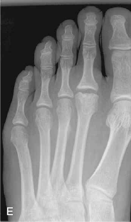 △ E는 Freiberg 병으로, 연골하 피로골절로 인해 제2중족골 또는 제3중족골두의 골괴사를 보인다.