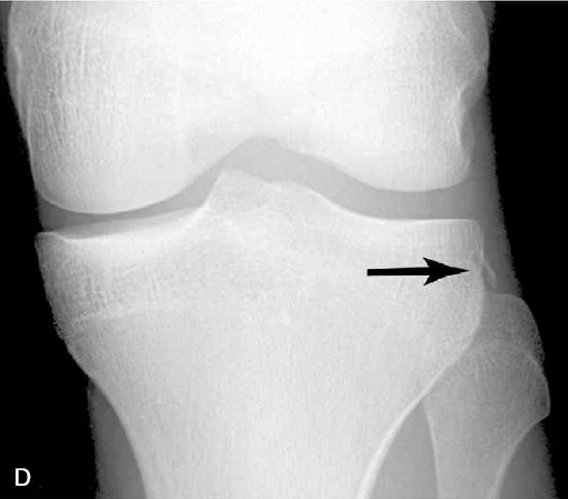 △ D는 Segond 골절에 해당. 근위 외측 경골의 견열 골절(화살표)에 해당한다.