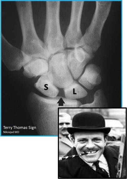 주상월상간 해리는 주상골과 월상골 사이의 인대 파열의 결과로 나타난다. 손목의 전후영상(AP view)에서 주상골과 월상골 사이의 간격이 넓어져 있는 것으로 알 수 있으며, 테리 토마스 징후(Terry Thomas sign)로 알려져 있다. 참고로 테리 토마스(1911-1990)는 치아가 벌어진 영국 코미디 배우다.