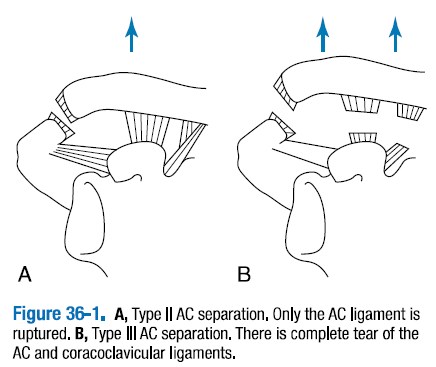 A 그림은 견봉쇄골 탈구 제 2유형(Type Ⅱ AC separation)으로 견봉쇄골인대만 파열된 것