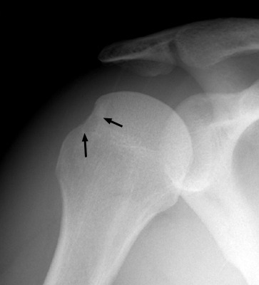 8. 전후면 영상에서 어깨 전방탈구의 방사선상 특징은 무엇인가?