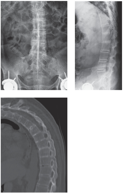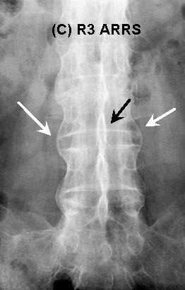 이 케이스는 'Aunt Minnie'이다. 강직성 척추염의 틀림없는 특징은 단순 방사선 영상과 시상면 CT에서 명백히 드러난다. 강직성 척추염은 가장 흔한 혈청검사 음성형의 척추관절병증(seronegative spondyloarthropathy)이고 남성에서 압도적으로 많다. 질환의 발병은 15~35세 사이에서 발생하고 90% 이상이 HLA-B27 양성이다. 임상적으로 이러한 환자들은 요통과 강직이 존재한다. 질환이 진행됨에 따라 현저한 흉추후만과 제한된 요추전만이 두드러지게 나타난다.