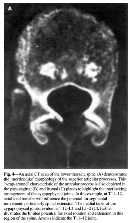- thoracic spine의 안정성은 rib cage와 그 관절면으로 증가