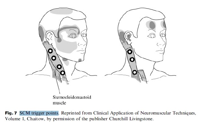 - SCM 또는 upper cervical joint로부터의 referred pain은 과활성화된 SCM과 억제된 DNF와 연관되어 짧아진 후두하근(suboccipitalis)의 muscle imbalance와 연관되어짐.