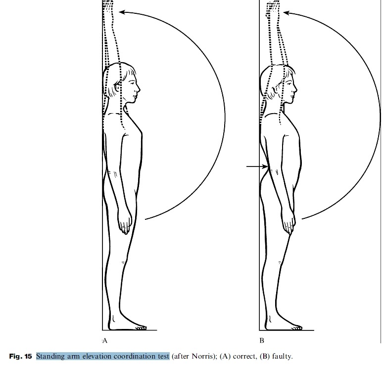 A simple functional test for evaluating mid-thoracic extension mobility is the standing arm elevation test (Fig. 15). To perform this test follow these steps: