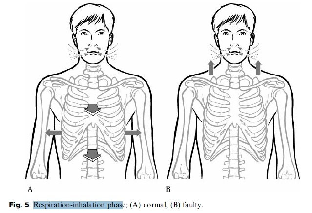 Faulty respiration secondary to the sternosymphyseal syndrome occurs due to lower rib compression on the diaphragm (Lewit 1999; Liebenson 1999a, 1999b). The accessory muscles of respiration such as the scalenes and shoulder girdle elevators substitute for the inhibited diaphragm and result in upper chest breathing predominating over belly breathing (Fig. 5) (Simons et al. 1999; Lewit 1980, 1999; Liebenson et al. 1998; Liebenson 1999b). In the seated position the patient breathes by vertically raising their chest rather than widening the rib cage in the horizontal plane (Lewit 1980, 1999; Liebenson et al. 1998; Liebenson 1999b).
