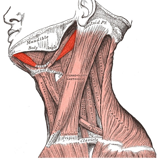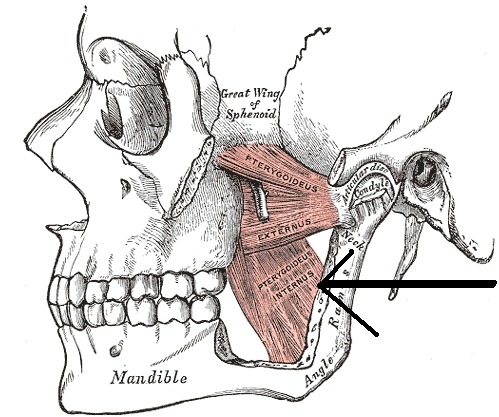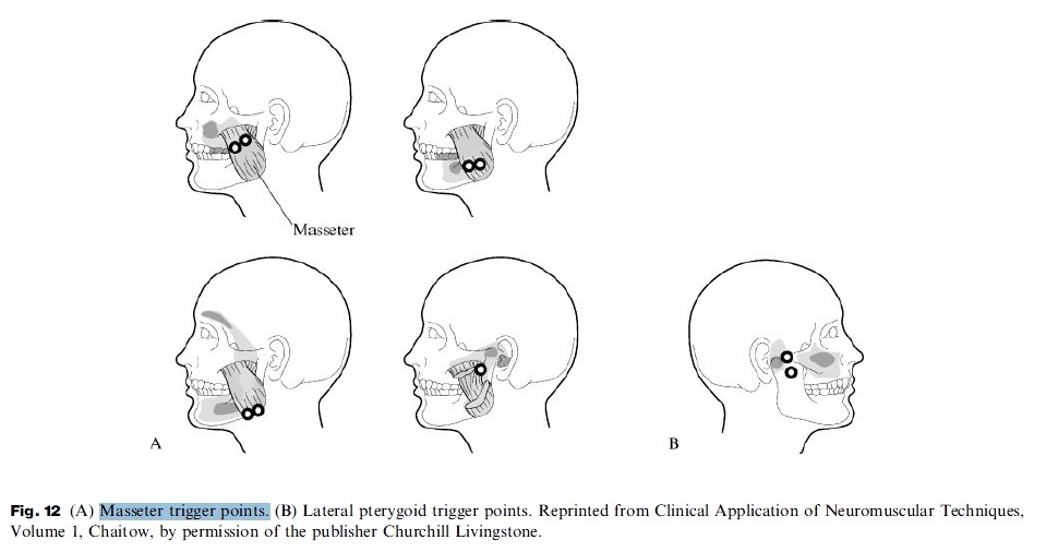 - 교근과 외측 익돌근, TMJ의 referred pain은 짧아진 교근과 익돌근과 연관됨. 악이복근(digastricus) 억제와 combined된..