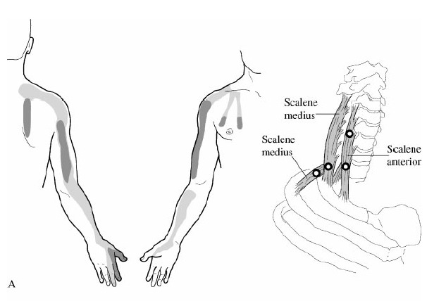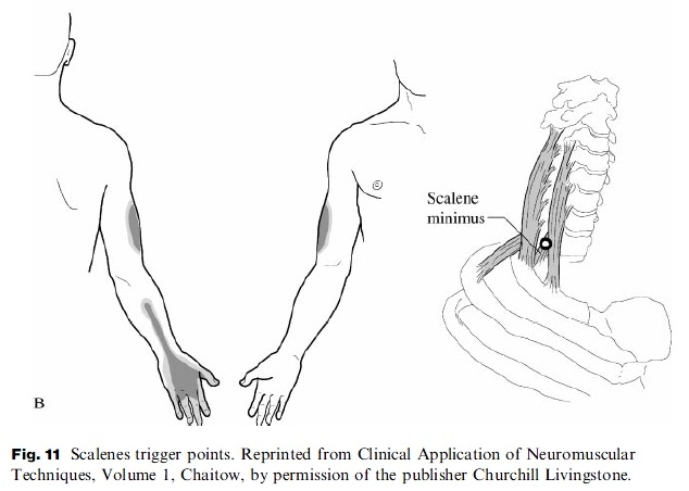 Pain referred from scalenes or upper trapezius muscles or upper ribs is related to muscle imbalance involving overactive