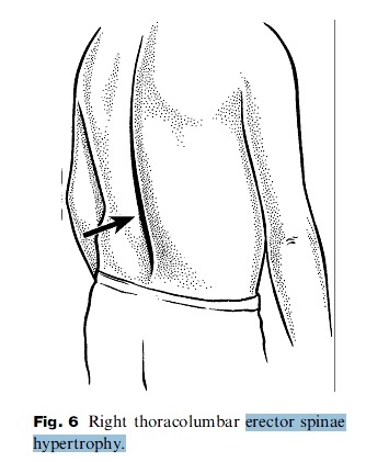 - lumbar lordosis의 증가 => thoracolumbar erector spinae hypertrophy(척추기립근 과활성화)
