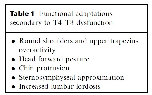 limitations, and performance deficits which can all result from this endemic postural disorder (Lewit 1996, 1999; Liebenson et al. 1998; Liebenson 1999). In the kyphotic posture the sternum and symphysis pubis approximate affecting not just the joints already mentioned but key muscles such as the diaphragm in basic functions such as respiration. Tables 1 and 2 summarize some of the more clinically relevant examples of functional adaptation and biomechanical overload secondary to mid-thoracic dysfunction.
