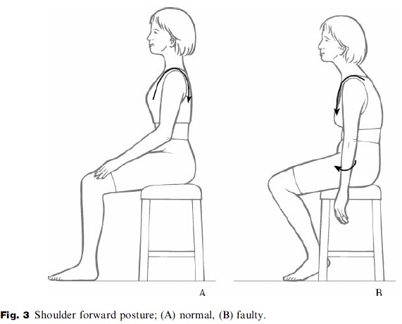 Increased mid-thoracic kyphosis pitches the shoulders forward into a rounded and internally rotated position (Fig. 3) (Janda 1996, 1998;Liebenson et al. 1998). With the shoulders rolled forward the pectorals habituate to a shortened