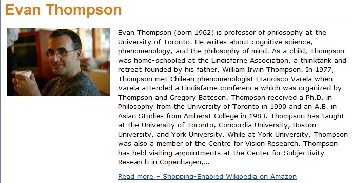 참고) Evan Thompson (born 1962) is professor of philosophy at the University of Toronto. He writes about cognitive science, phenomenology, and the philosophy of mind. As a child, Thompson was home-schooled at the Lindisfarne Association, a thinktank and retreat founded by his father, William Irwin Thompson. In 1977, Thompson met Chilean phenomenologist Francisco Varela when Varela attended a Lindisfarne conference which was organized by Thompson and Gregory Bateson. Thompson received a Ph.D. in Philosophy from the University of Toronto in 1990 and an A.B. in Asian Studies from Amherst College in 1983.