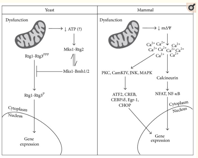Scheme comparing the classical retrograde signaling pathways in yeast and mammals. In yeast, mitochondrial dysfunction leads to decreases in intracellular ATP concentration, which may favor Rtg2-Mks1 interaction [54] allowing Rtg1-Rtg3 activation. In mammals, mitochondrial dysfunction translates into drops in mitochondrial membrane potential, causing increments in intracellular calcium. Calcium-dependent kinases and phosphatases are then activated culminating with the activation of different transcription factors. Alternative retrograde signaling pathways in yeast, mammals, and other model organisms are discussed in the text.