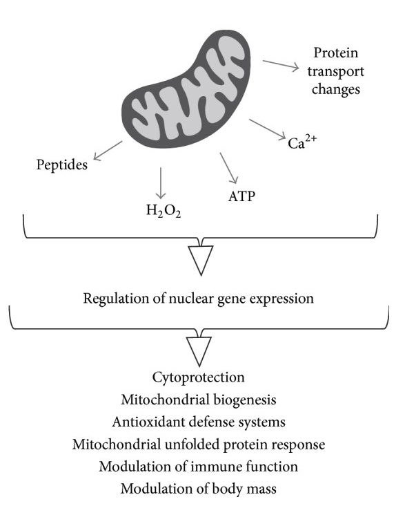 The evolution of this endosymbiotic relationship between mitochondria and the host cell resulted in transfer of genetic material so that, currently, most mitochondrial proteins (but not all of them) are coded in the nucleus. In this scenario, the need for a communication system between mitochondria and the nucleus becomes evident, necessary not only to coordinate mitochondrial protein synthesis during biogenesis of the organelle, but also to communicate eventual mitochondrial malfunctions, triggering compensatory responses in the nucleus. This communication system was described to operate in various organisms and involves antegrade (nucleus to mitochondria), retrograde (mitochondria-to-nucleus) as well as intermitochondrial pathways [12]. Mitochondrial signaling continues to be studied and is uncovering a central role of mitochondria in an increasing number of homeostatic systems. This review focuses on retrograde signaling, discussing triggers, molecular pathways, and outcomes known so far. Special attention is devoted to mitochondrial-derived peptides as signaling molecules.