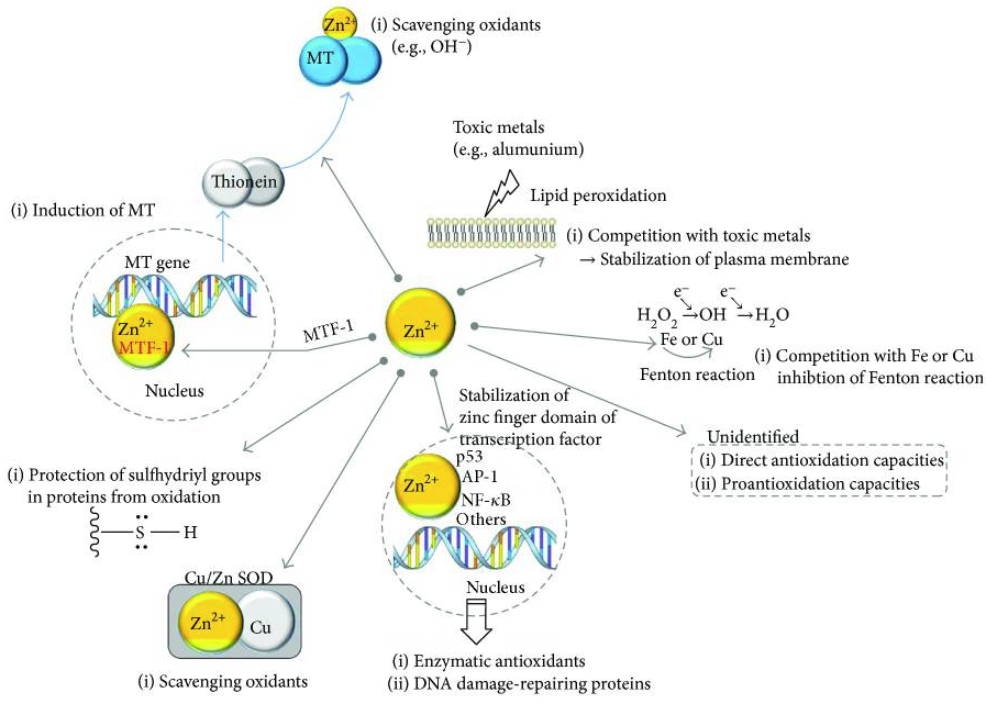 아연이 산화환원 저항 금속이지만 copper/zinc-superoxide dismutase, 세포벽 안정화, 단백질 sulfhydryl 그룹 보호, 메탈로네인 발현의 upregulation 의 효과로 항산화효과를 보임.