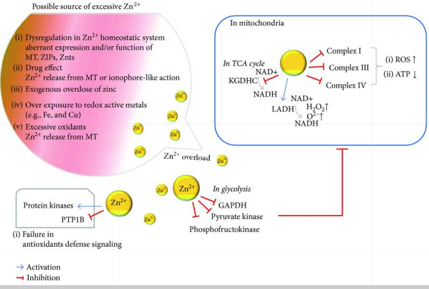Involvement of zinc as a prooxidant. ATP: adenosine triphosphate; complex I: NADH:ubiquinone oxidoreductase; complex III: cytochrome bc1 complex; complex IV: cytochrome c oxidase; GAPDH: glyceraldehyde-3-phosphate dehydrogenase; KGDHC: alpha-ketoglutarate dehydrogenase complex; LADH: lipoamide dehydrogenase; MT: metallothionein; NADH: nicotinamide adenine dinucleotide; PTP1B: protein tyrosine phosphatase 1B; ROS: reactive oxygen species; TCA: tricarboxylic acid, (NADH); ZIP: zinc importer; ZnT: zinc transporter.