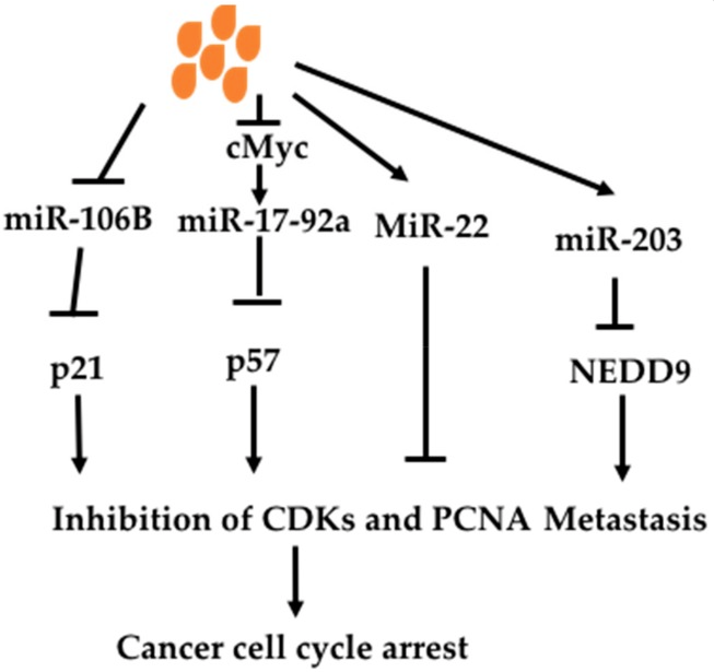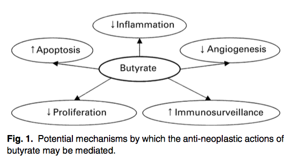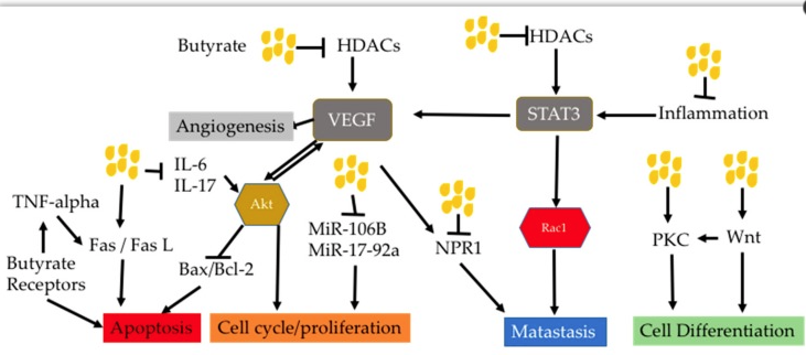 The intestinal microbiota is well known to have multiple benefits on human health, including cancer prevention and treatment. The effects are partially mediated by microbiota-produced short chain fatty acids (SCFAs) such as butyrate, propionate and acetate. The anti-cancer effect of butyrate has been demonstrated in cancer cell cultures and animal models of cancer. Butyrate, as a signaling molecule, has effects on multiple signaling pathways. The most studied effect is its inhibition on histone deacetylase (HDAC), which leads to alterations of several important oncogenic signaling pathways such as JAK2/STAT3, VEGF. Butyrate can interfere with both mitochondrial apoptotic and extrinsic apoptotic pathways. In addition, butyrate also reduces gut inflammation by promoting T-regulatory cell differentiation with decreased activities of the NF-κB and STAT3 pathways. Through PKC and Wnt pathways, butyrate increases cancer cell differentiation. Furthermore, butyrate regulates oncogenic signaling molecules through microRNAs and methylation. Therefore, butyrate has the potential to be incorporated into cancer prevention and treatment regimens. In this review we summarize recent progress in butyrate research and discuss the future development of butyrate as an anti-cancer agent with emphasis on its effects on oncogenic signaling pathways. The low bioavailability of butyrate is a problem, which precludes clinical application. The disadvantage of butyrate for medicinal applications may be overcome by several approaches including nano-delivery, analogue development and combination use with other anti-cancer agents or phytochemicals.