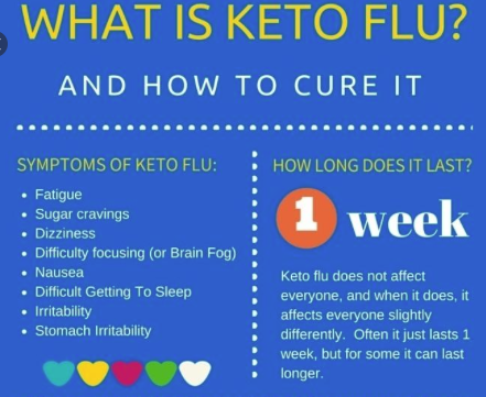 당질연소에서 지방연소로 전환하는 동안에 일부 사람들은 케토플루라는 불편감을 경험. 구취, 잦은 배뇨, 피로감, 경미한 어지러움, 저혈당, 변비, 탄수화물 갈망, 근육통과 같은 증상이 나타남.