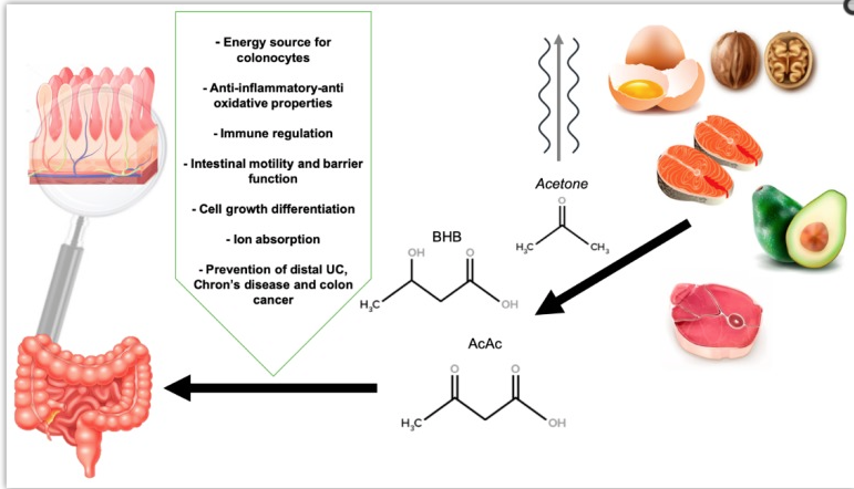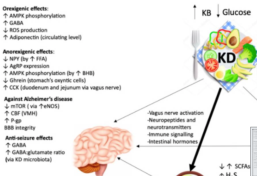 케톤식이 초래하는 장내세균 변화는 낮은 염증수치와 연관되어 있음. 케토제닉 다이어트를 하면서 섬유질(프리바이오틱스)을 많이 섭취하면 락토바실러스, 비피도박테리아와 같은 유익균을 증식시키는데 장내세균군이 섬유질을 뷰티레이트같은 지방산으로 전환하도록 함. short chain fatty acids 중 butyrate(뷰티레이트)는 장세포에 영향을 줘서 대장암 위험을 낮추고 혈당을 낮추고 중성지방을 낮추고 HDL콜레스테롤을 높이고 혈압을 낮추고 내장지방을 줄임.