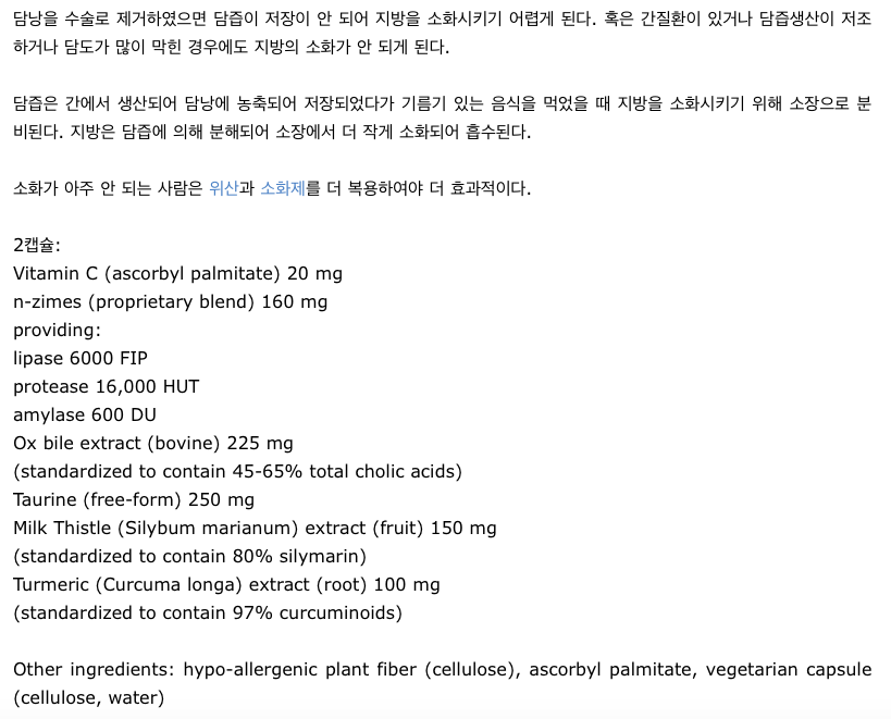 담낭은 먹은 지방을 분해하는 간이 분비하는 담즙을 저장함. 담낭을 제거해도 대부분의 사람은 약간의 지방을 먹는데 큰 문제는 없음. 많은 양의 지방을 섭취하려면 단계적으로 높여야 함. 담즙 보충제(소화효소)를 복용해서 도움을 받을 수 있음.