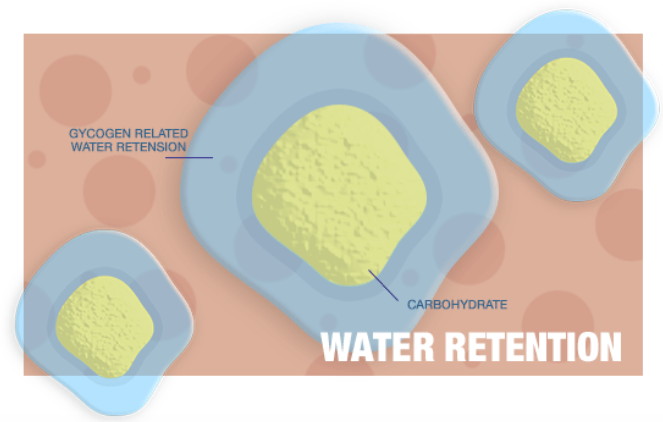 어떠한 체중 감량방식을 이용하든 처음에는 수분이 줄어듬. 이는 근육에 저장된 글리코겐이 빠져나오기 때문임. 체내에 저장된 글리코겐은 물로 차있음.