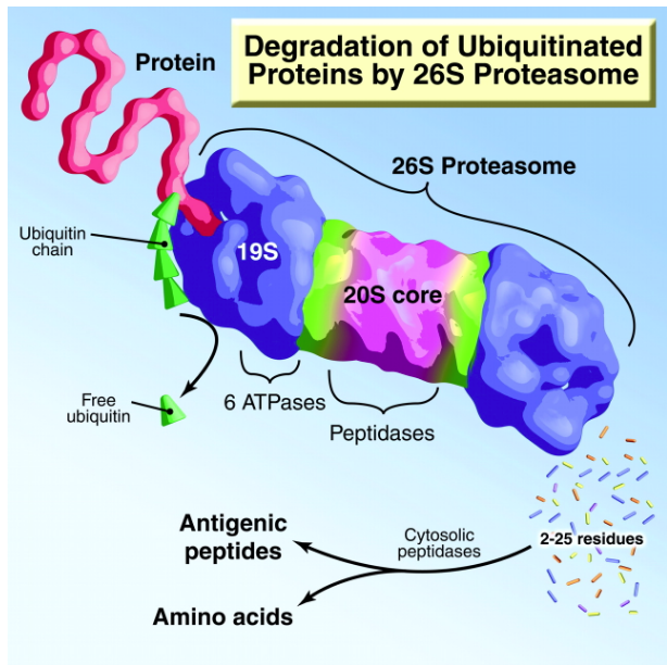 The ubiquitin (Ub)-proteasome pathway (UPP) of protein degradation. Ub is conjugated to proteins that are destined for degradation by an ATP-dependent process that involves three enzymes. A chain of five Ub molecules attached to the protein substrate is sufficient for the complex to be recognized by the 26S proteasome. In addition to ATP-dependent reactions, Ub is removed and the protein is linearized and injected into the central core of the proteasome, where it is digested to peptides. The peptides are degraded to amino acids by peptidases in the cytoplasm or used in antigen presentation. Illustration by Josh Gramling—Gramling Medical Illustration.