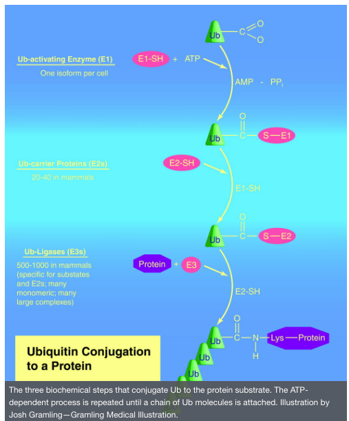 The three biochemical steps that conjugate Ub to the protein substrate. The ATP-dependent process is repeated until a chain of Ub molecules is attached. Illustration by Josh Gramling—Gramling Medical Illustration.