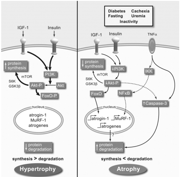 The balance between protein synthesis and degradation determines whether muscles hypertrophy or atrophy. With hypertrophy, protein synthesis exceeds degradation because the phosphatidylinositol 3 kinase (PI3-K)/Akt pathway stimulates protein synthesis and phosphorylates the FoxO transcription factors that stimulate protein degradative processes. In diseases that suppress insulin/IGF-1 signaling, the PI3-K/Akt pathway is depressed, leading to decreased protein synthesis and FoxO phosphorylation. This allows FoxO to stimulate the expression of the E3 enzymes atrogin-1 and muscle ring finger-1 (MuRF-1) and protein degradation. Another stimulus, inflammatory cytokines such as TNF-α, increases the activation of NF-κB, leading to expression of the E3 enzyme MuRF-1 and protein degradation. Illustration by Josh Gramling—Gramling Medical Illustration.