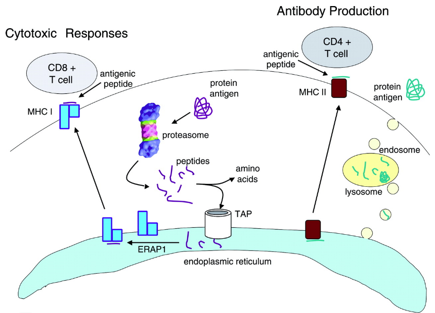 To bind to most MHC class I molecules, peptides have to be eight to nine residues long. Approximately 70 to 80% of proteasome products are too small to serve as antigens (56). The products that are used as antigenic precursors not only are the eight- to nine-residue peptides but also the longer ones with additional amino acids on their amino termini. They are taken up into the ER by a specific peptide transport system, called transporter associated with antigen processing (TAP). Within the ER is a newly discovered aminopeptidase, endoplasmic reticulum aminopeptidase 1 (ERAP1), which has the unusual capacity to trim extra amino acids off the longer precursors and then stops at eight to nine residues, the precise length for binding to MHC molecules (53,57,58).