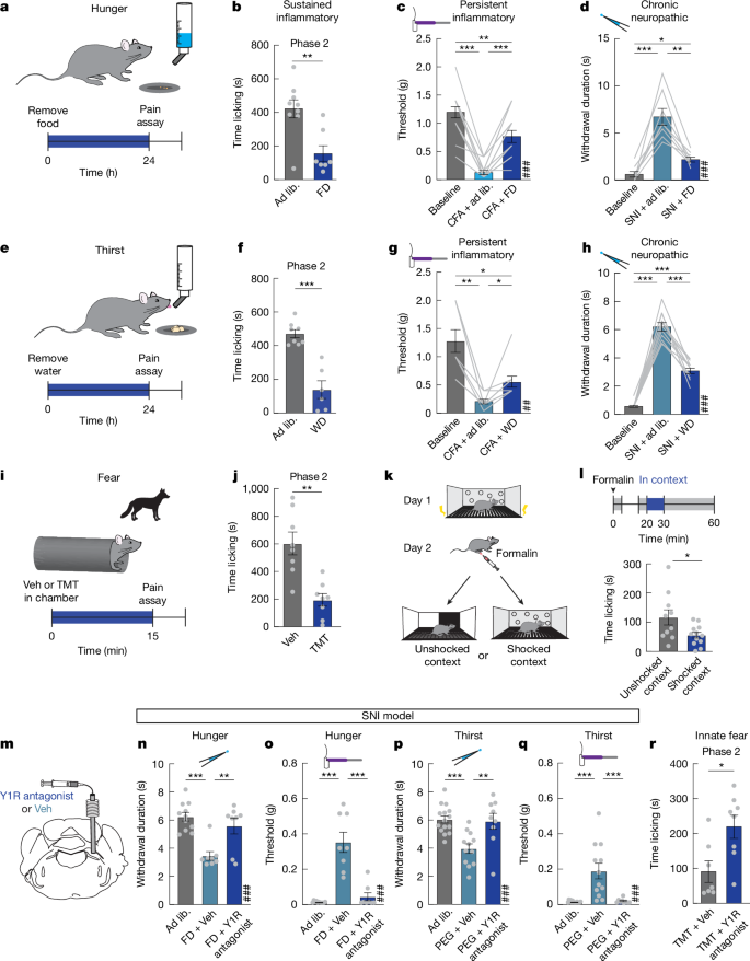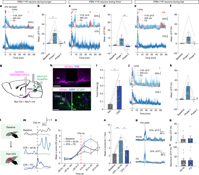 An alligator clip (UQ003, Uniquers) was applied to the ventral surface of the paw as previously described to establish the baseline neural response to mechanical pain38. At least two days later, CFA was injected into the plantar surface of the paw as described above. The neural response to clipping the paw was recorded 48 h later in ad libitum-fed mice. Food was then removed from the cage. The neural response to clipping the paw was measured again, 24 h later, in food-deprived mice. Paw size was measured daily using a plethysmometer (Stoelting, 57140) to ensure that any effects were not due to changes in inflammation levels.