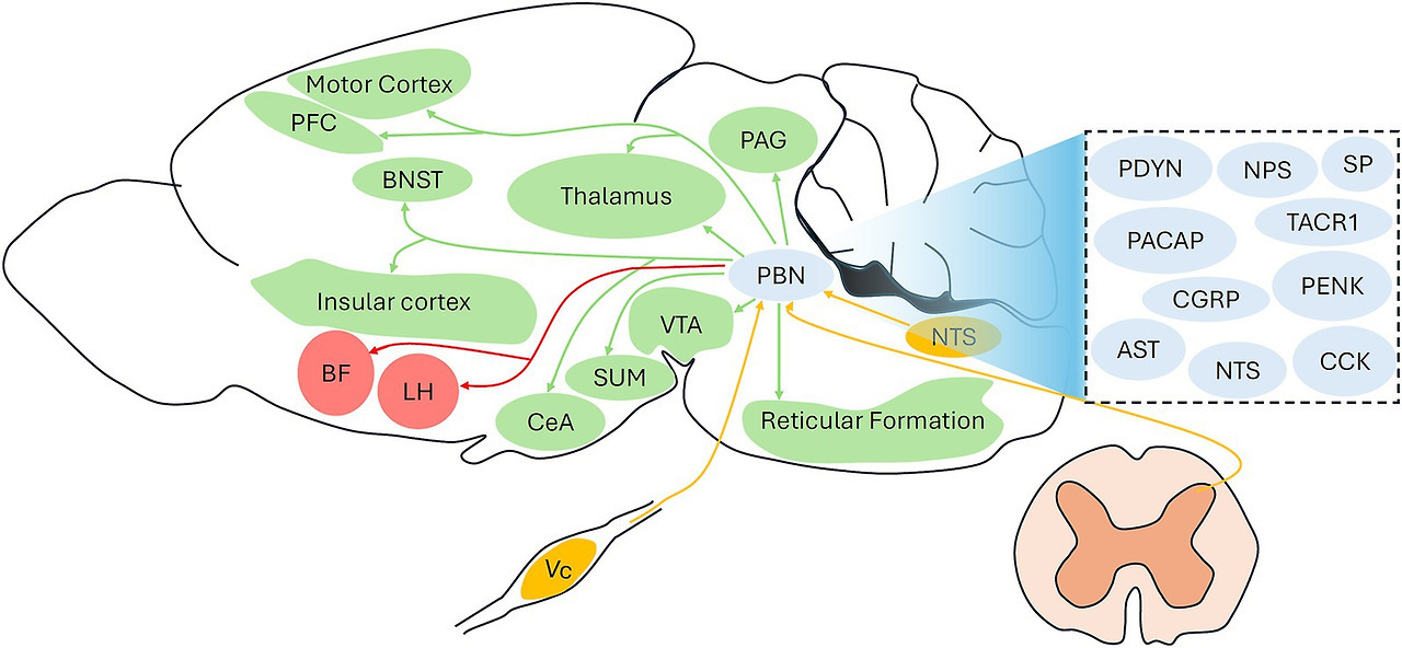 | Taste, feeding | Medial PBN | Hypothalamus, insula | Appetite regulation |