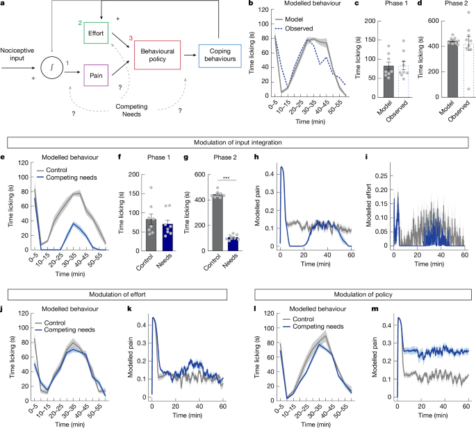 To model the control of pain-evoked licking behaviour under competing needs, we assume that animals aim to reduce experienced pain while also minimizing effort expended70. Animals show multiple behaviours in response to acute and chronic pain, including active coping methods like wound licking (an instinctive behaviour that cleans and disinfects wounds71) and more passive strategies such as paw guarding to reduce allodynia; for the purpose of comparison to experimental data, this model focuses only on wound licking behaviour. Excess wound licking leads to risk of lesion formation and infection72, and the act of wound licking costs energy and saliva and comes with an ‘opportunity cost’, in that it prevents the animal from pursuing other activities required for survival. ‘Effort’ in this model may therefore be taken as an abstract variable that encapsulates the overall negative consequences of licking more than is necessary to reduce pain.