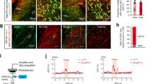 Fibre photometry after SNI. Three weeks following fibre-optic implant surgeries, animals were habituated to Plexiglas chambers, elevated wire mesh, and patch cable attachment for 1 h each 2 days prior to experiments. On the day of experimentation, animals were habituated in Plexiglas chambers on elevated wire mesh for 1 h before having patch cables attached to the implanted fibre-optics and habituating for an additional 30 min with the experimenter in the room. Baseline recordings were performed to innocuous and noxious stimuli according to the following paradigm: 0.07 g von Frey filament, 1.0 g von Frey filament, acetone, and blunted pin prick. Calcium transients were collected continuously (FP3002, Neurophotometrics) during the stimulation protocol. Each stimulus was applied to the lateral surface of the left hindpaw three times 2 min apart, and all three responses were averaged to represent the animal’s response to that stimulus. Following baseline recordings, animals underwent SNI surgery in the left hindlimb to induce neuropathic pain. The fibre photometry protocol was repeated 21 days after SNI surgery.