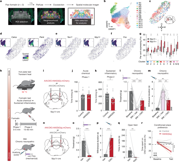 Consistent changes in neural activity during persistent pain are not clearly discernible from human imaging studies8. We considered how state-tuned neurons in the brain could be identified. We focused on the lateral parabrachial nucleus (lPBN), a major entry point of sensory information from the periphery and the first site of integration of many affective behavioural states. Populations of neurons in the lPBN receive direct input from the dorsal horn of the spinal cord and respond to acute nociceptive stimuli, and prolonged activation of excitatory lPBN neurons can drive a chronic pain-like state13,20,21,22. This strategic location makes the lPBN an efficient site at which pain could be modulated.
