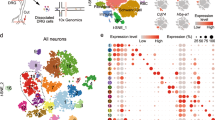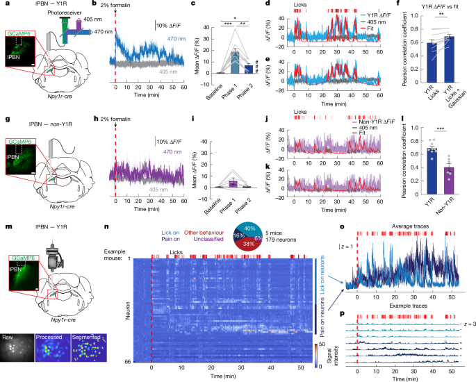 Calcium imaging data were analysed using custom code based on the open-source analysis pipeline Minian68. In brief, videos were preprocessed to remove glow artefacts and background signal and correct for motion using both rigid and non-rigid motion correction. Then, units were detected and traces extracted using the CNMF algorithm. Two spatial and two temporal updates were used to identify cells based on spatial footprints and temporal dynamics. Each identified unit was either confirmed or rejected by the experimenter. The calcium traces and behavioural videos were loaded into the open-source MATLAB GUI Bento for behavioural annotation69. We annotated for paw-licking, face-grooming, rearing and walking during the first 5 min before the formalin injection, and during the 60 min after injection. The Pearson correlation between the behaviours and each individual neuron was computed, after z-scoring the neurons using the mean and s.d. of their baseline activity. A neuron was classified as a ‘lick on’ neuron when the correlation was significantly larger than expected—that is, when the correlation was larger than 97.5% of all correlations obtained by reshuffling the paw-licking bouts 3,000 times. We classified neurons as correlated with ‘other behaviour’ in the same manner, using the annotations for rearing, grooming and walking. To identify neurons modulated by the pain state, we take the activity of neurons during which no annotated behaviour occurs and compare it to their baseline activity. A neuron is then classified as a ‘pain on’ neuron when it is: (1) unclassified by a behaviour; and (2) the s.d. of activity after formalin injection was significantly larger than the s.d. of activity before—that is, the difference was larger than 97.5% of all differences obtained by reshuffling the time series of the neuron 3,000 times. Conversely, a neuron is a ‘pain off’ neuron when it is: (1) unclassified by a behaviour; and (2) the median activity is significantly lower after the injection.