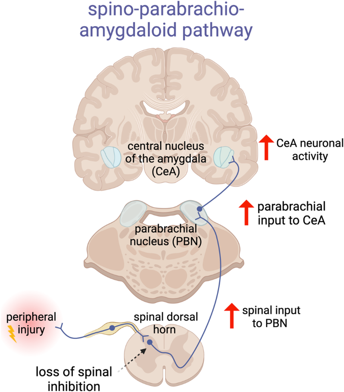 lPBN의 뉴런 집단은 척수 후각으로부터 직접 입력을 받아 급성 통각 자극에 반응하며,