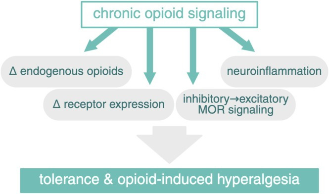 Chronic opioid signaling. Chronic opioid signaling can lead to changes in endogenous opioids, altered receptor expression, neuroinflammation, and a shift from inhibitory to excitatory MOR signaling, leading to tolerance and opioid‐induced hyperalgesia. MOR, μ‐opioid receptor. Created in BioRender. van Strien, W. (2025), https://BioRender.com/szjn7pr.