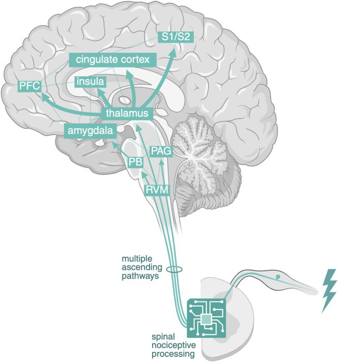 In pain processing, the PB plays a central role in affective‐motivational pain dimensions, directly connecting with the central nucleus of the amygdala (CeA) and the midbrain reward system, and indirectly with the insula through a thalamic relay (Chiang et al. 2019; Raver et al. 2020; Benarroch 2022). CeA‐projecting parabrachial neurons have been shown to play a crucial role in aversive signaling and learning from painful stimuli by the subsequent formation of a threat memory (Han et al. 2015). Also, a recent study demonstrated that these neurons contribute to increased pain sensitivity after injury, with their inactivation alleviating injury‐induced pain without affecting baseline nociception (Torres‐Rodriguez et al. 2023). The PB also mediates escape responses to noxious stimuli through its connections to the reticular formation, independent of higher brain involvement (Barik et al. 2018). Additionally, it links ascending nociceptive information with descending modulatory pathways through projections to both the PAG and RVM (Chiang et al. 2019).