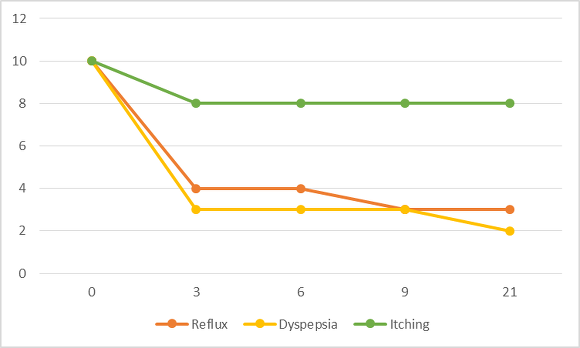 피부소양감과 발적은 NRS10->7~8 정도로 약한 호전, 식후 두통, 멍한증상 NRS10->5정도로 호전 보이고 있습니다.