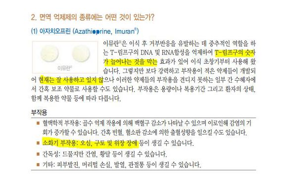 해당 환자들은 아자티오프린을 50-100mg을 매일, 2.5-6개월간 복용하였습니다. 측정된 부작용으로는 1명의 환자가 구역과 구토반응이 발생하여 2달 후에 치료를 중단한 사례가 있었다고 합니다.