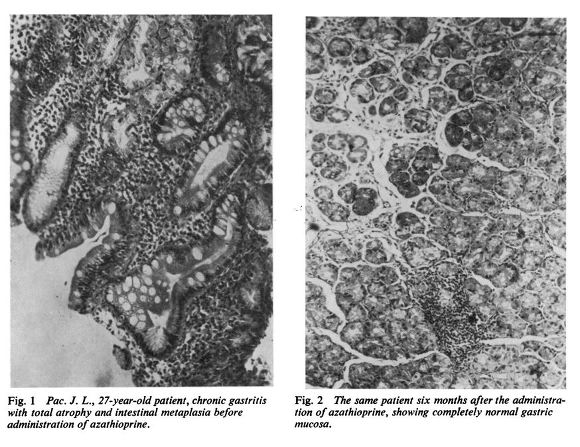 연구자들은 결과에서 환자의 상태, 투약량, 기간 등에 따라 다양했지만, 대체적으로 아자티오프린 복용 후 위장상피세포가 호전되었고, 위산 분비량이 증가하는 경향이 나타났다고 설명하고 있습니다. 생검상으로도 아무 변화가 없었던 경우도 있었으나, 위장상피세포가 재생된(Regeneration) 사례도 있었다 보고하고 있습니다.