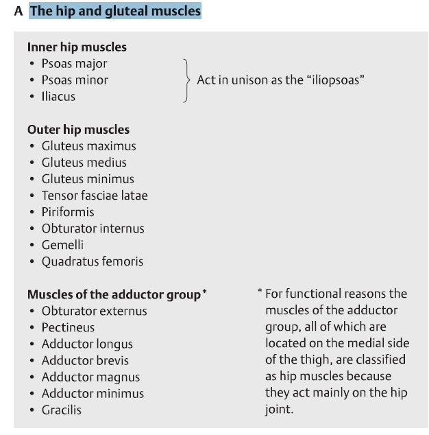 - 대둔근, 중둔근, 소둔근, 대퇴근막장근, 이상근, 내폐쇄근, gemelli, 대퇴방형근