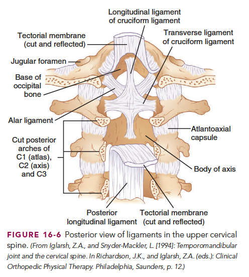 Because the upper cervical spine has sacrificed osteokinematic stability for greater arthrokinematic mobility, it is dependent on ligamentous support to allow basic function and avoid injury. Because of the unique and complex articulations present in the upper cervical region, specialized ligaments provide the needed stability. The dens is connected to the anterior rim of the foramen magnum by the apical ligament and the two obliquely oriented alar ligaments. The alar ligaments limit the amount of contralateral rotation that occurs at the atlantoaxial joint.6