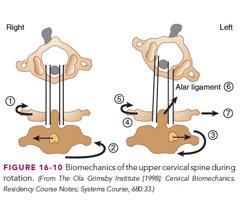 (3 ) The occiput and atlas rotate to the right approximately 40° and apply tension on the left alar ligament, which brings the axis into right rotation.