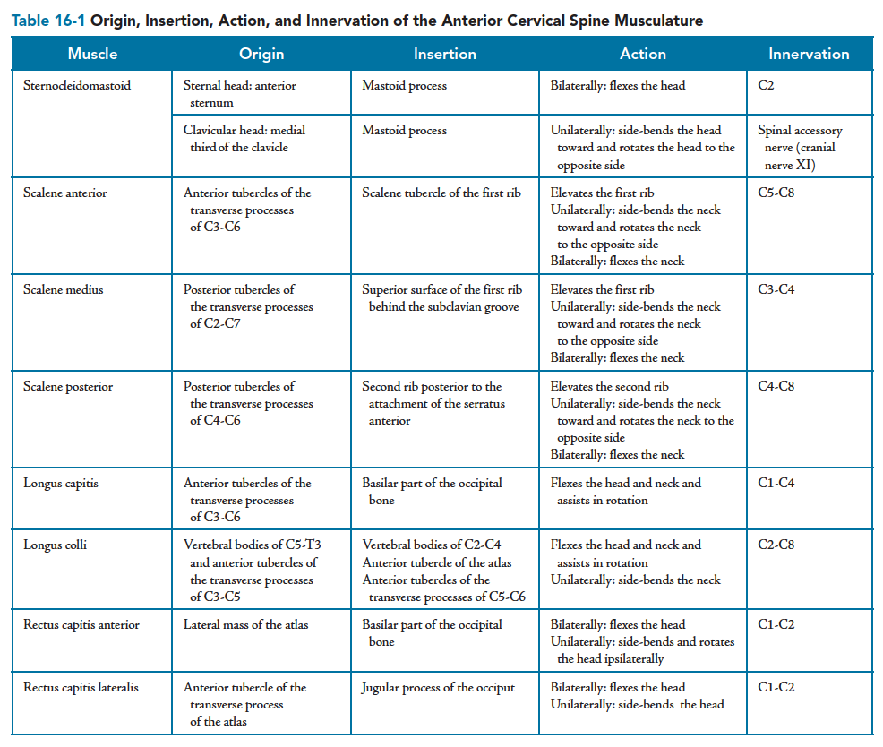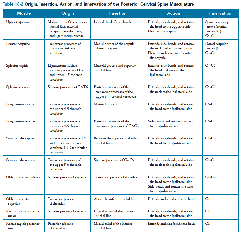 movements for the occiput, cervical spine, and upper part of the trunk. These muscles can be divided into anterior and posterior groups according to their attachment in relation to the transverse processes. Tables 16-1 and 16-2 list these muscles, including their origin, insertion, action, and innervation.