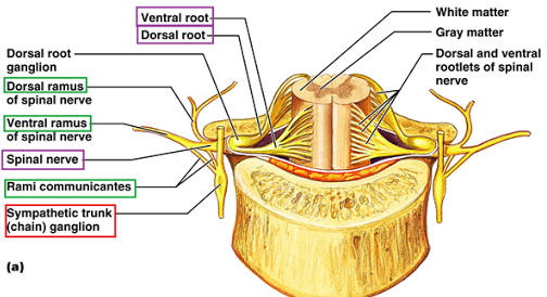 - 경추 신경근은 ventral (motor) and dorsal (sensory) roots가 나누어져 있고, 요추는 추간 구멍에서 척추신경이 혼합되어 형성되어 있음.