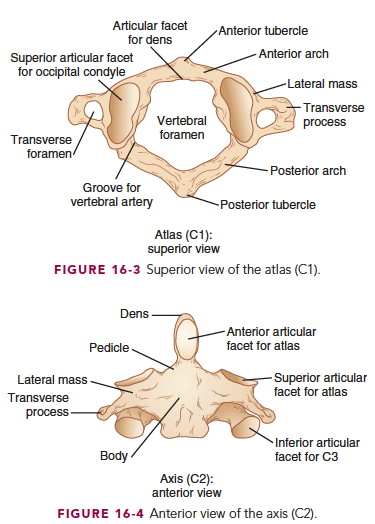 The first cervical vertebra (C1), the atlas, articulates with the occiput superiorly and the axis (C2) inferiorly. The atlas does not have a spinous process or a real vertebral body; however, the odontoid process (dens) of the axis functions as the body of C1 (see Fig. 16-4 ). The atlas consists of two lateral masses connected by anterior and posterior arches and transverse processes that provide for acceptance of weight through the articular processes.