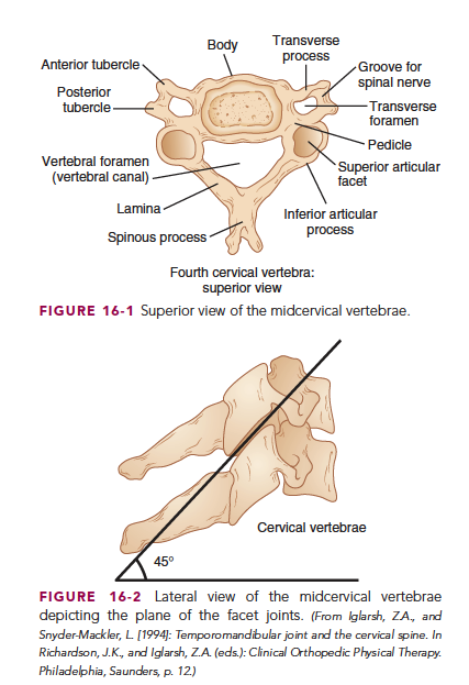 The superior surface of the vertebral bodies in the mid-cervical spine is concave in the frontal plane and convex in the sagittalplane, and the opposite is true for the inferior surfaces. These cervical vertebrae have two superior and two inferior facets that are located on the pedicles. The superior facets are oriented in a posterior direction, whereas the inferior facets are oriented in an anterior direction. The biplanar orientation of these joints requires that rotation and lateral flexion be coupled movements.